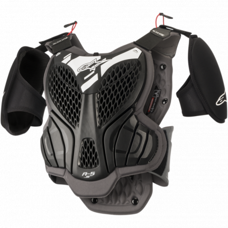 У панциря A-5 S також є корпуси, які сильно перфоровані для максимальної повітропроникності та вентиляції, що знижує температуру тіла та розсіює ударні сили. Завдяки жорстким оболонкам, виготовленим з суміші полімерних матеріалів з високими експлуатаційними характеристиками, панцир забезпечує оптимальну гнучкість та відмінну економію ваги. Отже, дитячий мотопанцир A-5 S від ALPINESTARS - це надійний, легкий та простий у використанні захисний елемент, який забезпечує високий рівень захисту та комфорту при їзді на бездоріжжі.