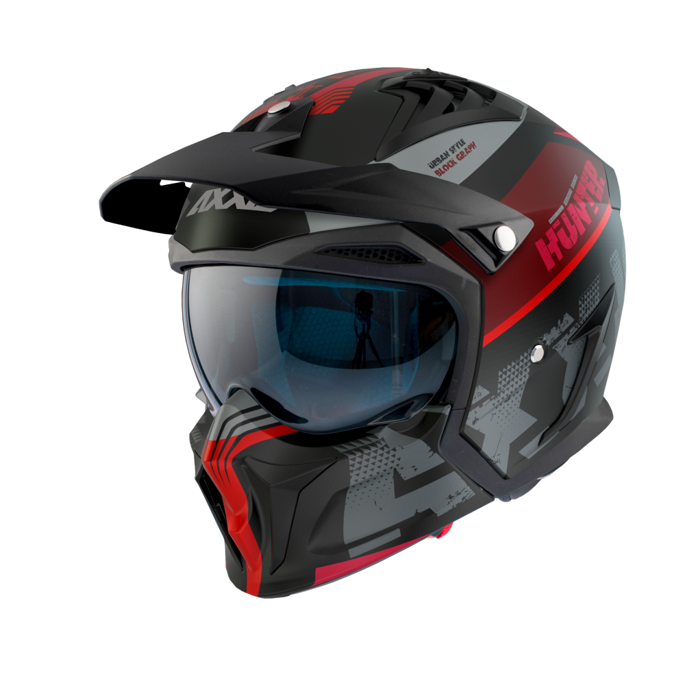 Шолом Axxis HUNTER SV BLOCK B5 BLACK RED GREY MATT поставляється з прозорим візором.