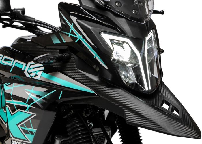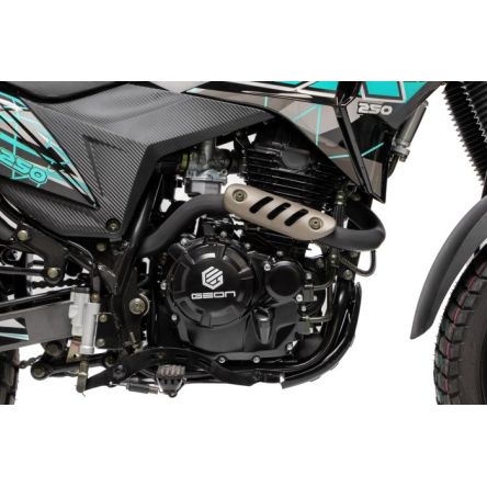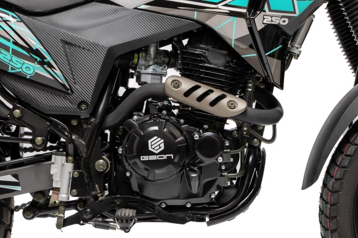 GEON ADX 250 FE Carb - це потужний і надійний мотоцикл, який ідеально підходить для поїздок по місту і за його межі. Цей мотоцикл оснащений двигуном об'ємом 250 см3, який забезпечує максимальну потужність 24,5 к.с при 7500 об / хв і максимальний крутний момент 23 Нм при 6000 об / хв. Система живлення - карбюратор, а система запалювання - CDI. GEON ADX 250 FE Carb має 6-ступеневу механічну коробку передач, що дозволяє легко і швидко перемикати передачі. Його охолодження здійснюється повітряно-мастильною системою.