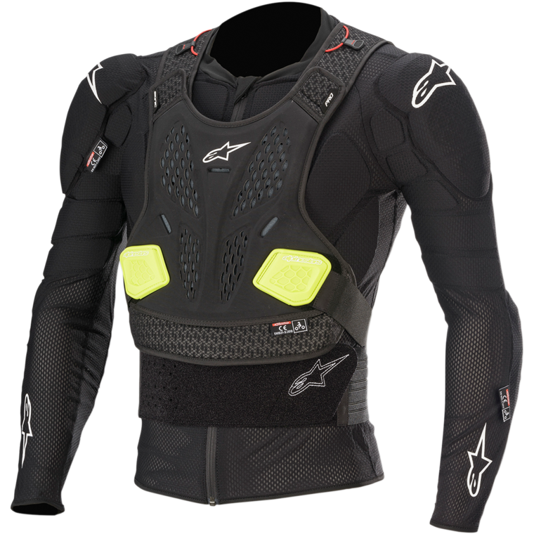 Защита груди эластичная, термоформированная и отлично вентилируемая, что обеспечивает комфортную посадку и фиксацию на теле с помощью плечевых и поясных ремней. Гибкие боковые панели легко и быстро фиксируются на теле мотоциклиста. Застёгивается защитная сетка на переднюю молнию. Дополнительные накладки-подушки на руках и груди служат для усиленной защиты.